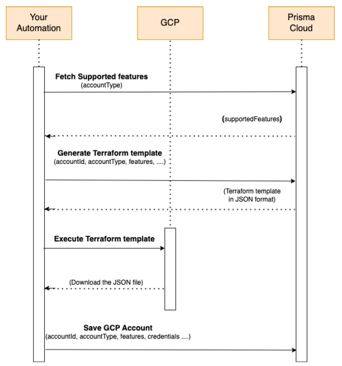Add GCP Account by using Add GCP Account API . Use the credentials, features, and states obtained in the previous steps in the request payload.